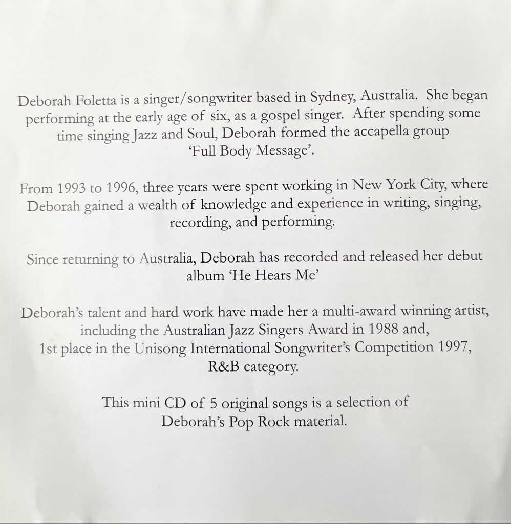 ” What You Are ” – is a 5 song EP of original Deborah Dicembre material recorded in 2000 in Sydney Australia. Produced by Doug Weaver and Deborah Dicembre . The series of pics below tell of the recording , the personnel and each song.